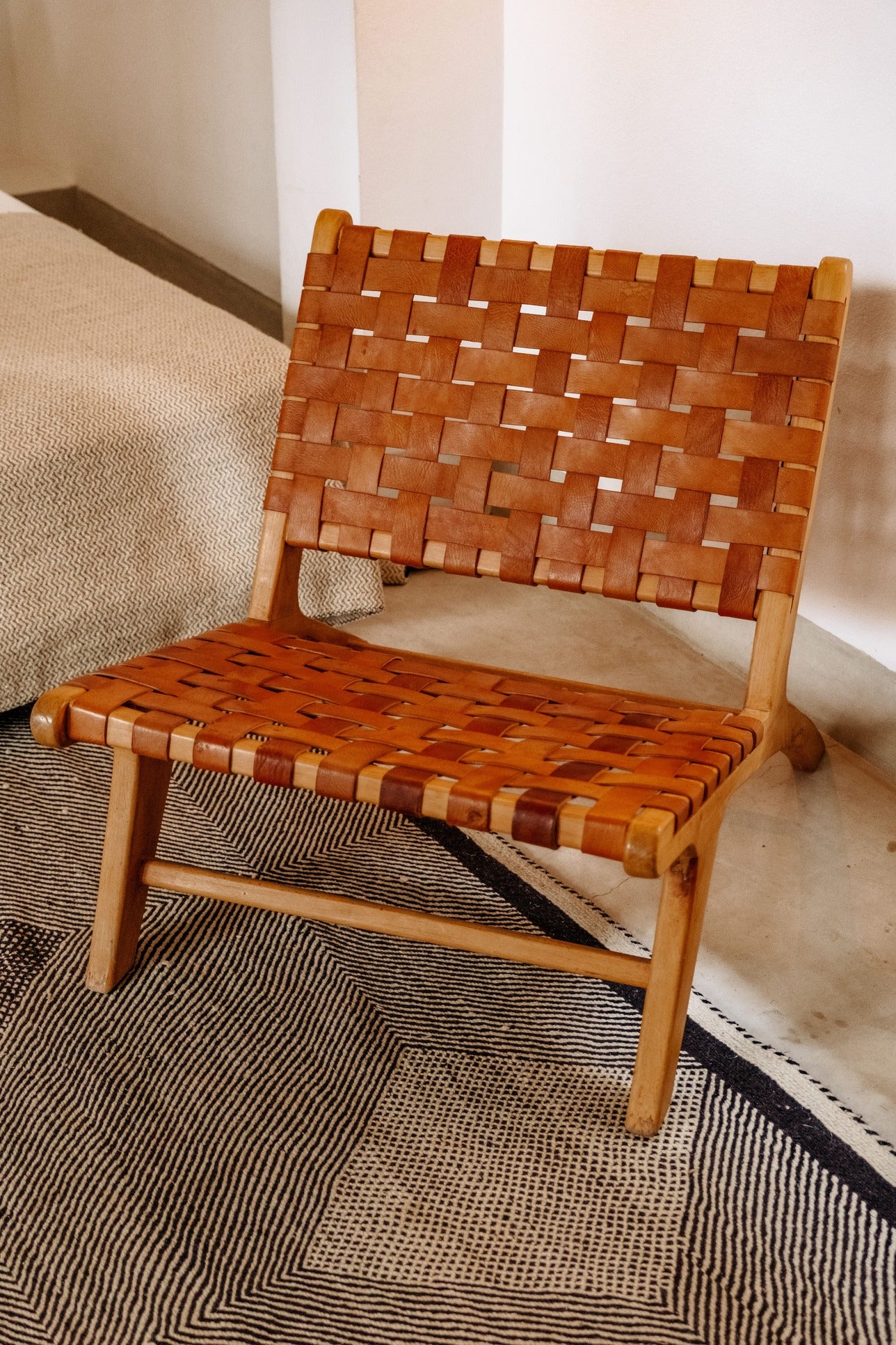 Le fauteuil Atlas associe une structure en bois massif à une assise et un dossier en cuir tressé. Solide et stable, il offre un confort souple grâce au travail du cuir. Ses proportions basses en font une pièce idéale pour un salon ou un coin lecture, pensée pour durer.