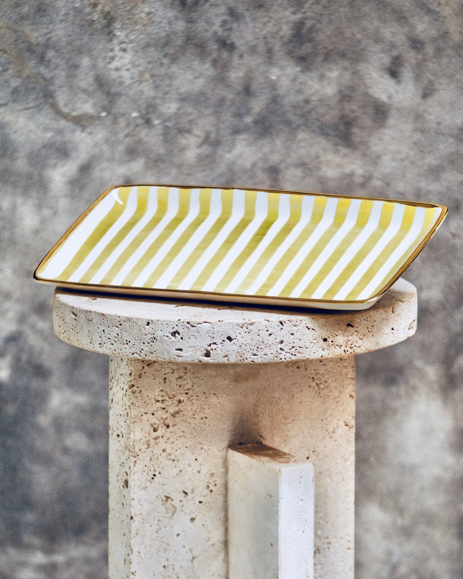 Fabrication artisanale : Façonné à la main à travers plusieurs étapes et trois cuissons, dont une à l’or 12 carats, chaque plateau demande près de dix jours de travail.