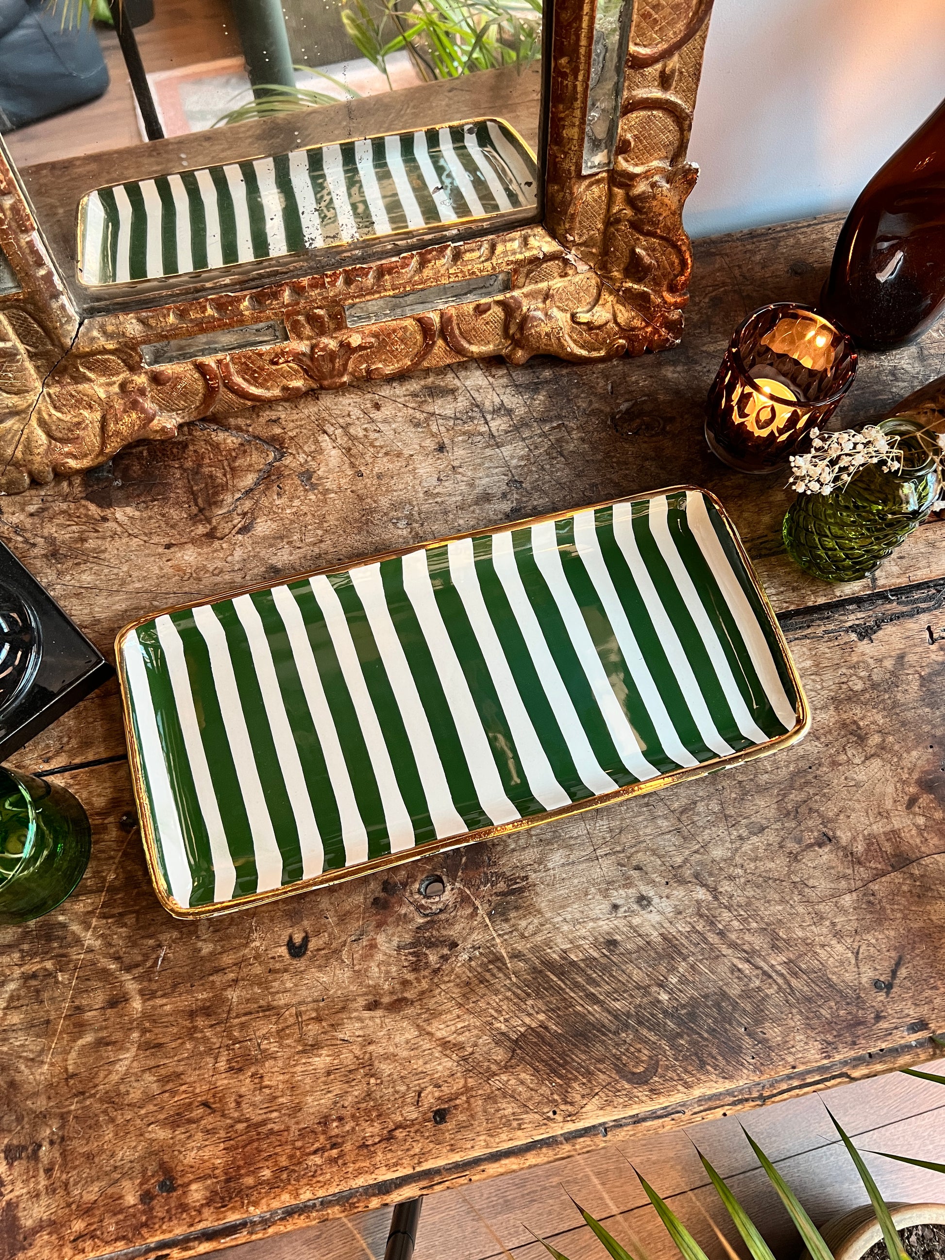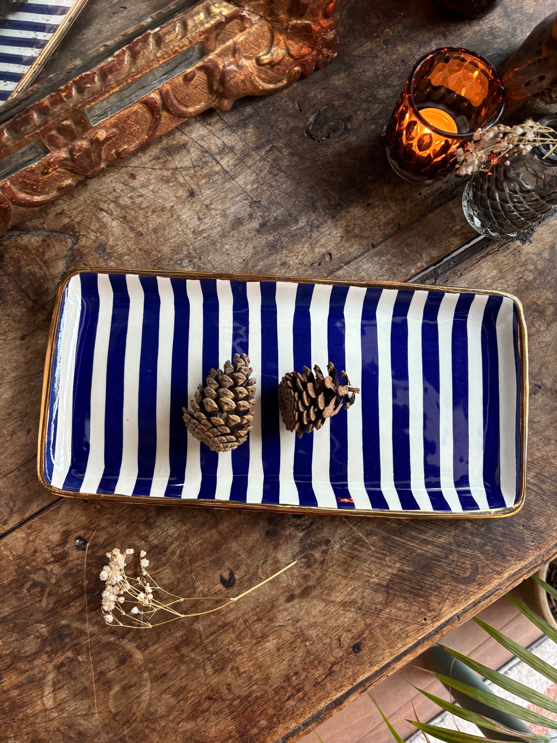 Notre plateau long rectangulaire aux contours dorés, un indispensable raffiné pour mettre en valeur vos douceurs sucrées ou plats salés. Son allure soignée et sa fabrication artisanale apportent une touche chaleureuse à votre table, que ce soit pour un brunch, un goûter ou un moment partagé.