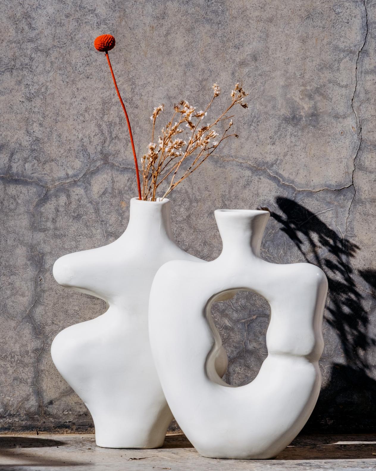 Les deux vases forment un duo libre et contrasté, entre tension des lignes et douceur des courbes, chacun affirmant sa propre identité.